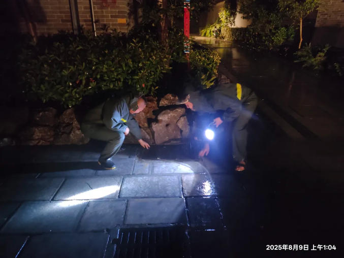 8月9日凌晨3時(shí)許強(qiáng)降雨來(lái)襲,雨情就是號(hào)令,工作人員立即赴一線,疏通排水、清理障礙,30分鐘內(nèi)完成了易積水路段的應(yīng)急響應(yīng)全流程閉環(huán)處置。